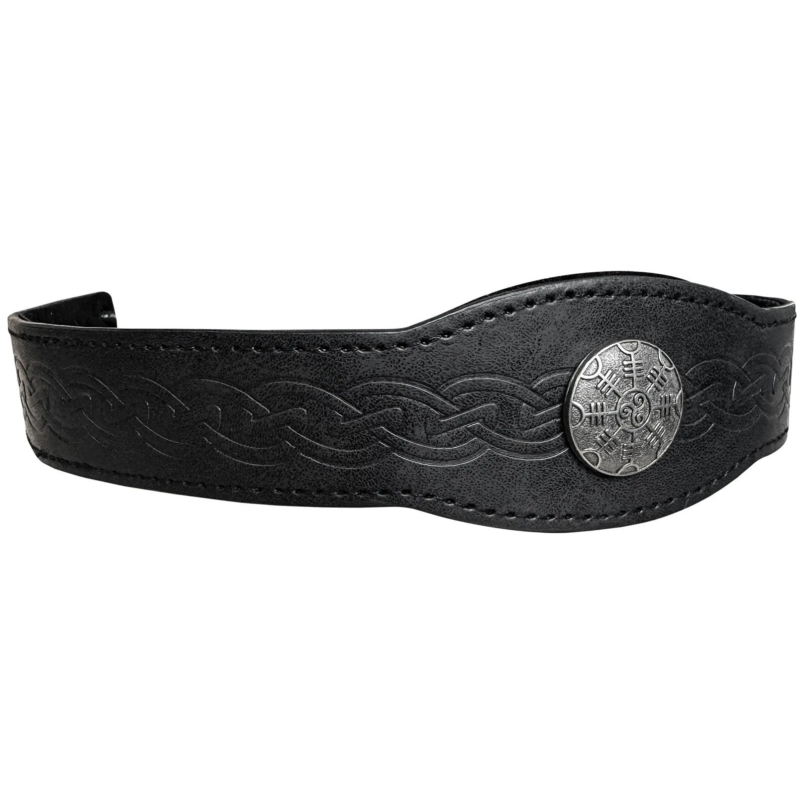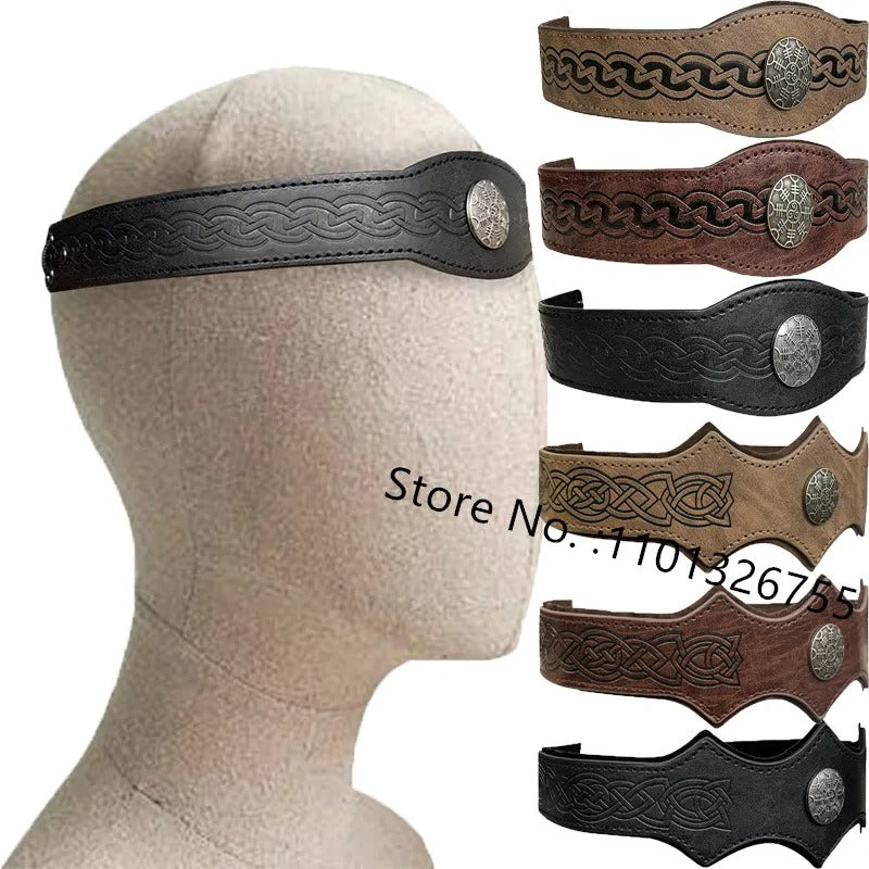 This adjustable faux leather headband showcases a central Ægishjálmr medallion and is embossed with intricate Viking knot patterns along the band. Designed for both comfort and style, the headpiece fits most head sizes (50–60 cm circumference) and is perfect for Viking reenactment, cosplay, stage performance, or themed festivals.